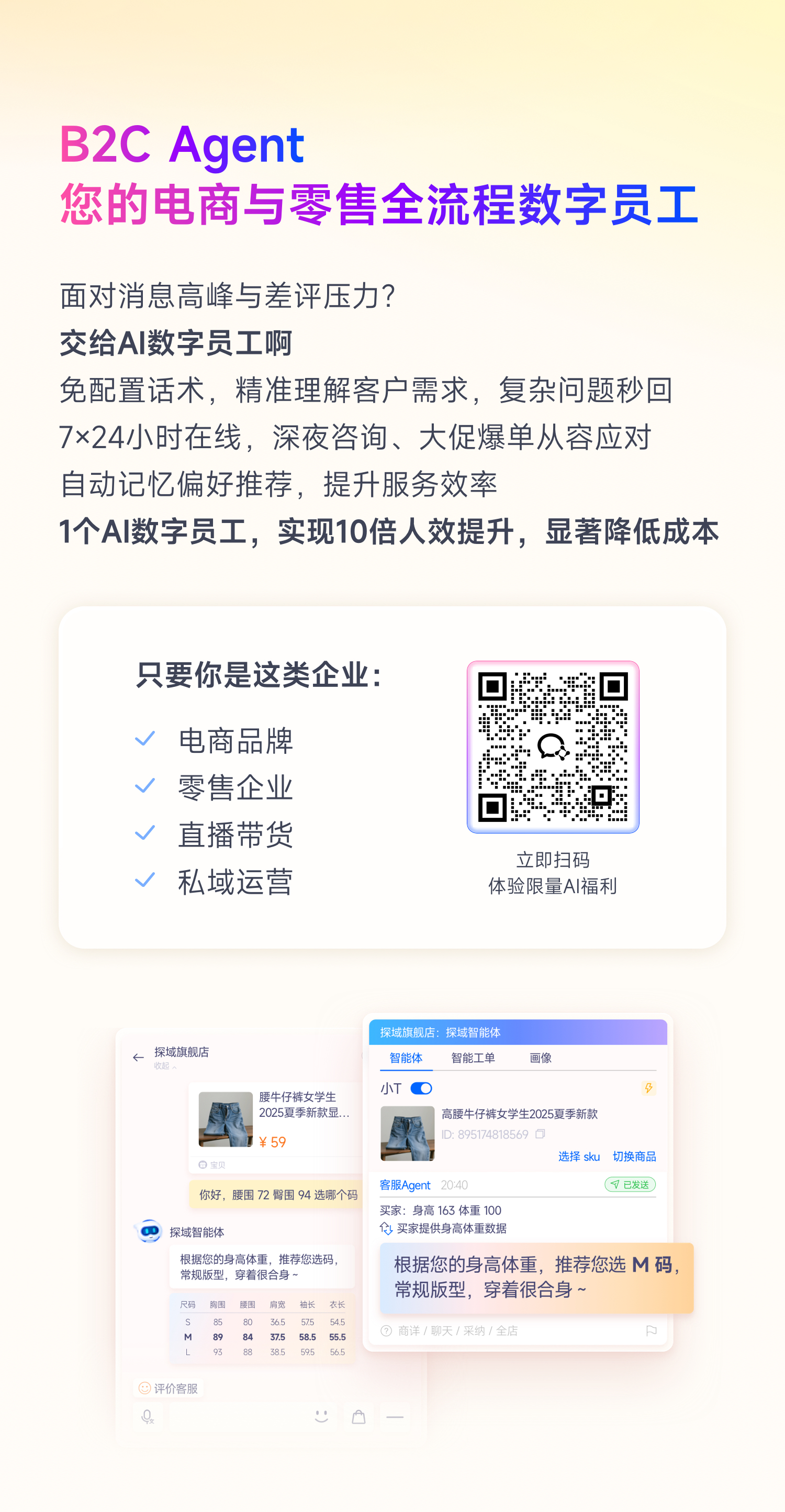 B2C Agent,覆盖客服、营销、运营、私域等核心场景,从前端营销获客、中端销售转化,再到后端交付服务与长期客户价值挖掘,全链路赋能;