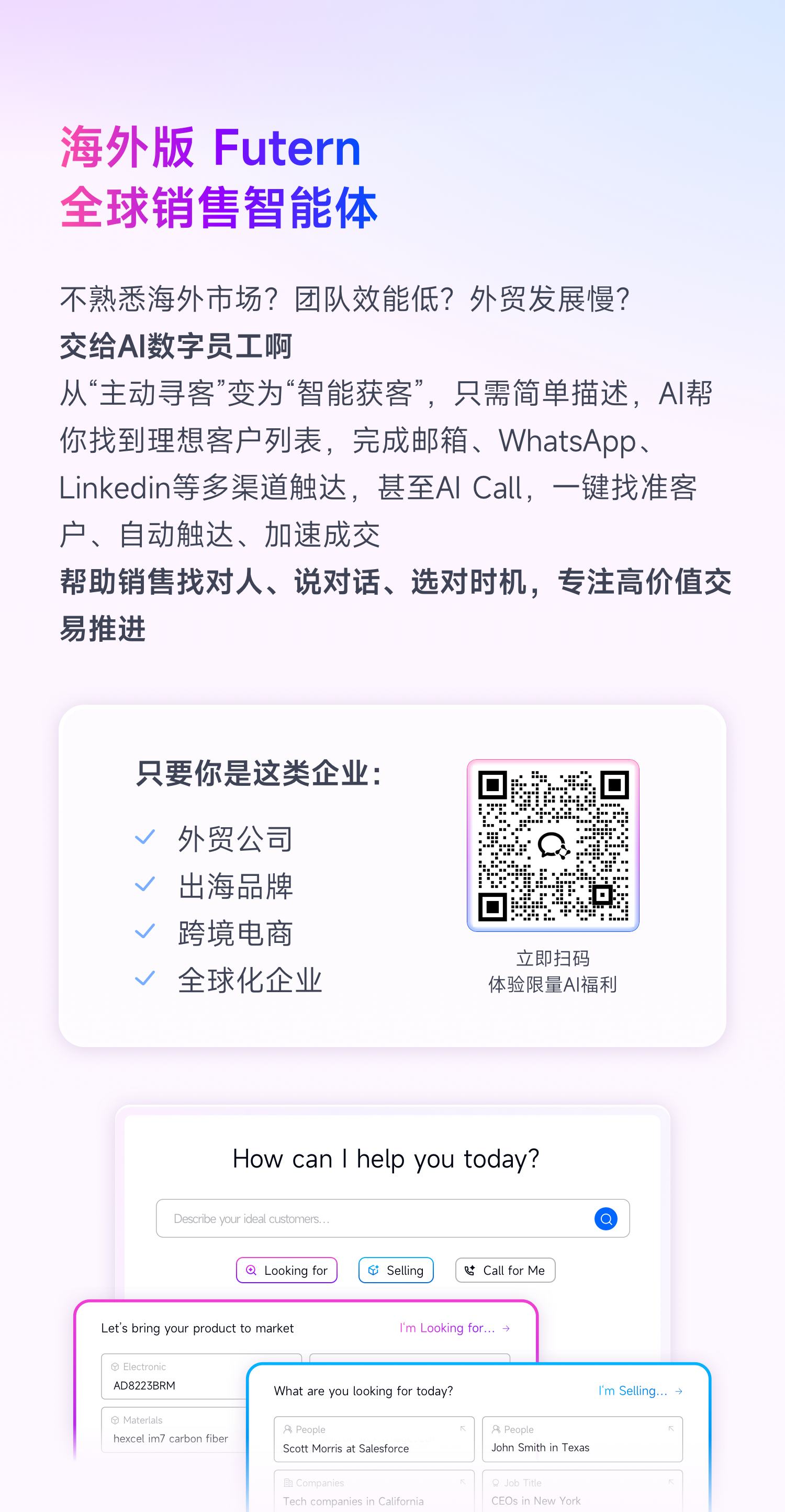 海外版Futern,依托丰富精准的全球商业数据,帮助外贸企业高效拓展海外客户和贸易合作伙伴。
