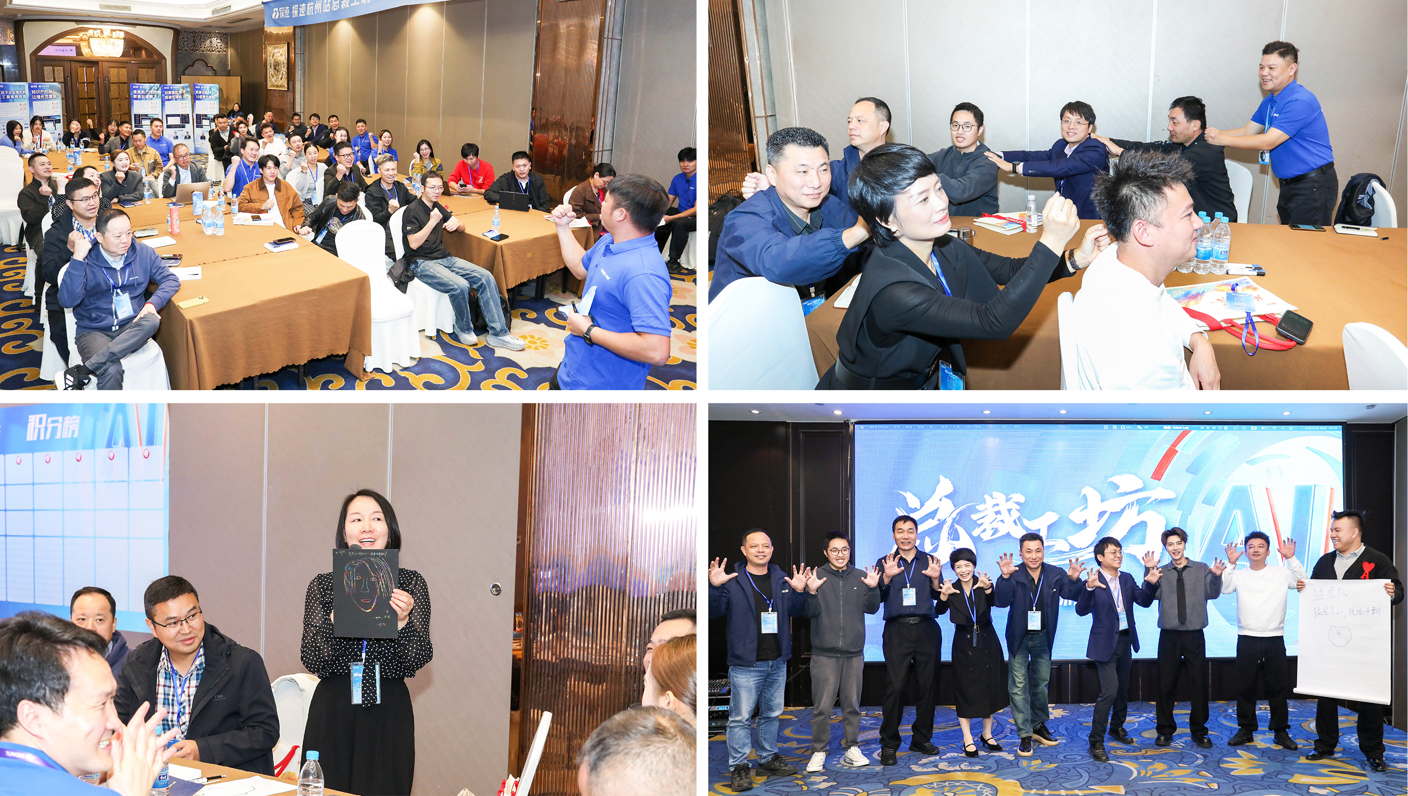 活动第一天,在教练的引导下,各位企业家朋友们通过团队画像、解手链等项目激情碰撞,迅速破冰融合。学员们不再是孤立的个体,而是在团队文化展示中,共同构思队名、口号与使命,找战友、喊口号,现场氛围在创意亮相与激昂宣言中瞬间点燃。当集结的号角吹响,所有学员都已整装待发,正式踏上这场为年终冲刺量身定制的AI增长之旅。